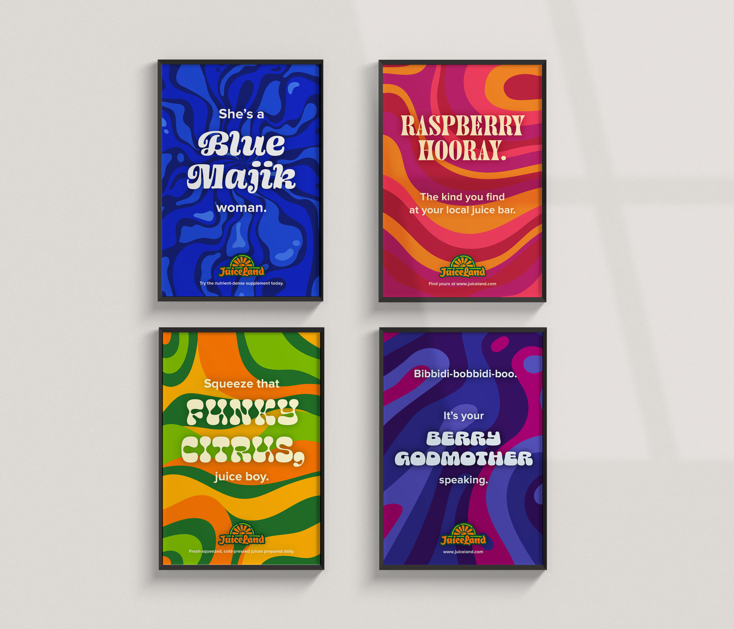 This campaign was targeted toward the general reader demographic of The Austin Chronicle and designed as quarter-page ads for the publication. JuiceLand is an Austin-based chain of juice bars serving a variety of fun and interesting beverages with clever names to match.